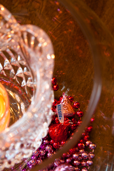 Bead necklaces were placed in the bottom and then delicious Hershey Kisses were scattered around in the beads. Then a second vase was placed in the center and a candle was lit. So lovely!