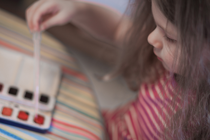 My granddaughter uses an eyedropper to place one drop of water in each watercolor pan.