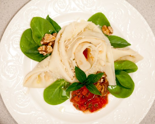 The Thai Basil and toasted walnuts are key to making this dish delicious. It’s also critical to make the pasta thin for forming the rose and making the serving size not too big.