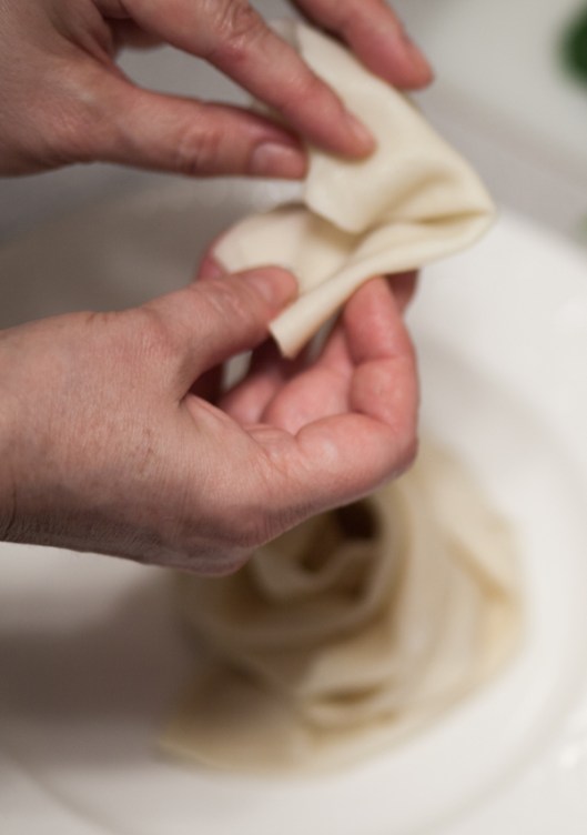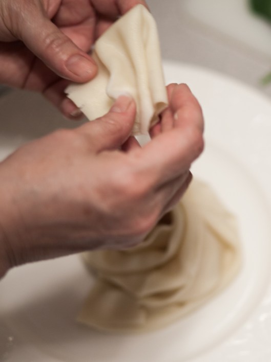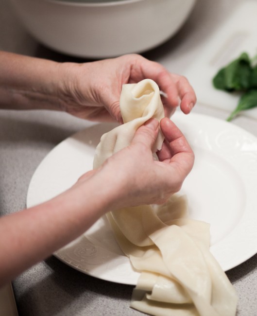 With the bud in the left hand, the long ribbon of pasta is wrapped around the bud clockwise. Occasionally the long ribbon of pasta is folded over to form a folded edge of a petal.
