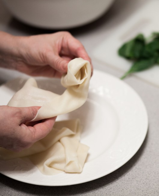 The flattened dough that comes out of the machine is folded in half and then run through the rollers on setting 1 again.