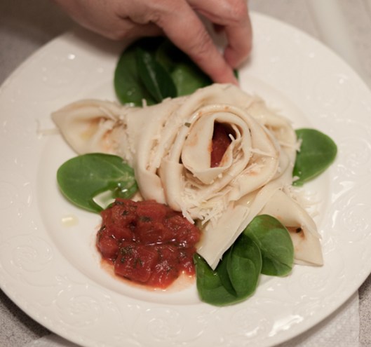 Once enough of the rose is established, it is placed on the serving plate and the folding and wrapping of the pasta ribbon continues around the rose.