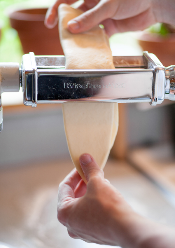The settings are changed with each pass of the dough. The dough is kept brushed with flour so it won’t stick to the rollers. When the dough becomes to long or too wide to fit the roller, it is cut into smaller pieces.