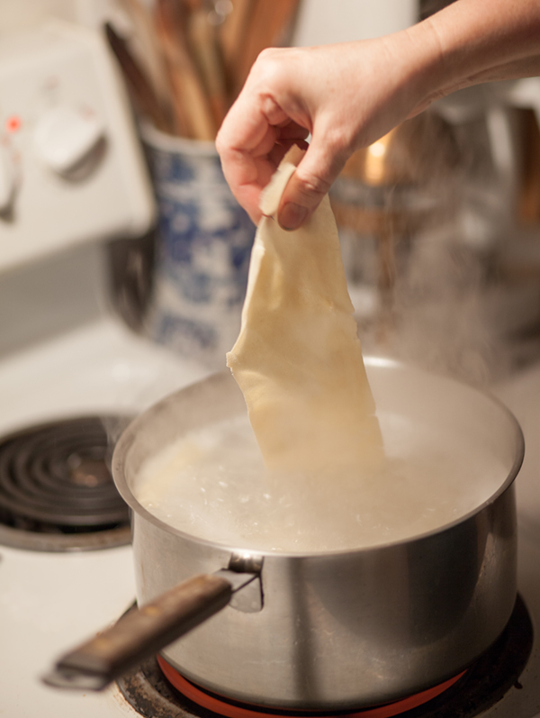 One long piece of pasta is dropped into boiling water.
