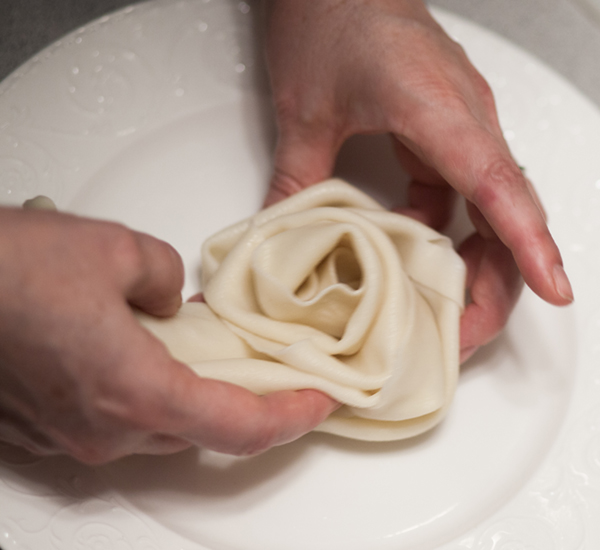 When the rose is the size desired, the pasta ribbon is cut off and the rose is positioned as desired.