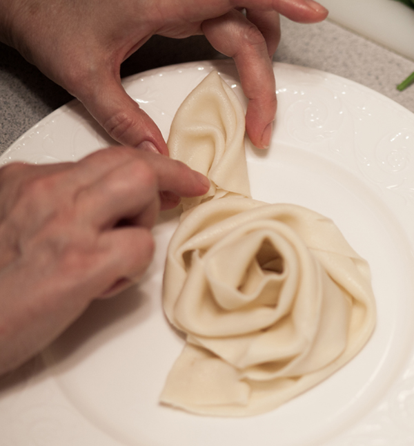 Place the bud under the edge of the rose.