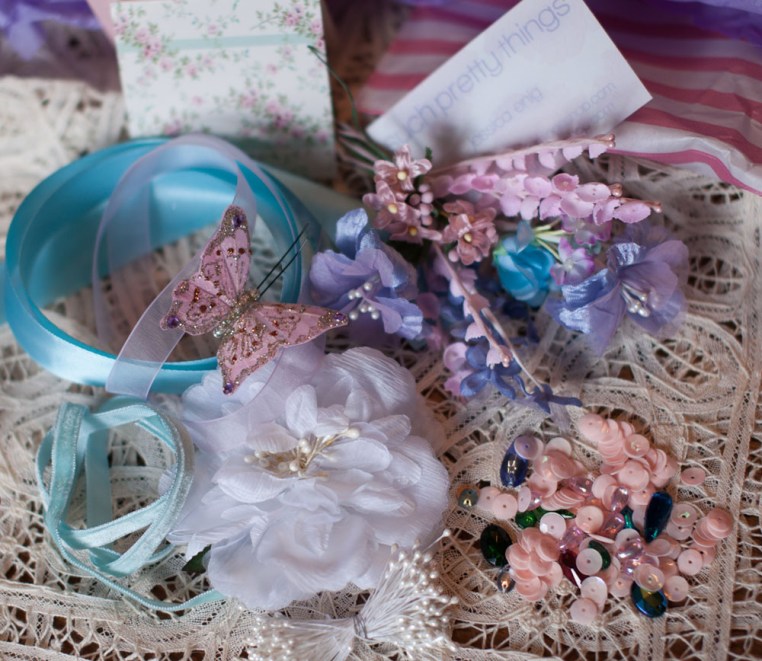 A delightful assortment of vintage millinery flowers, velvet, satin and sheer ribbon, pale pink sequins and gems and a glittery butterfly from Such Pretty Things.