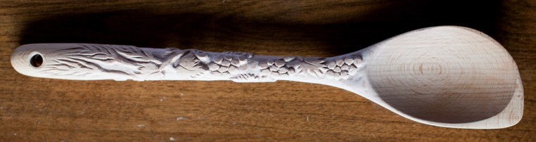 Wood spoon with wheat and grapes carved into the handle.