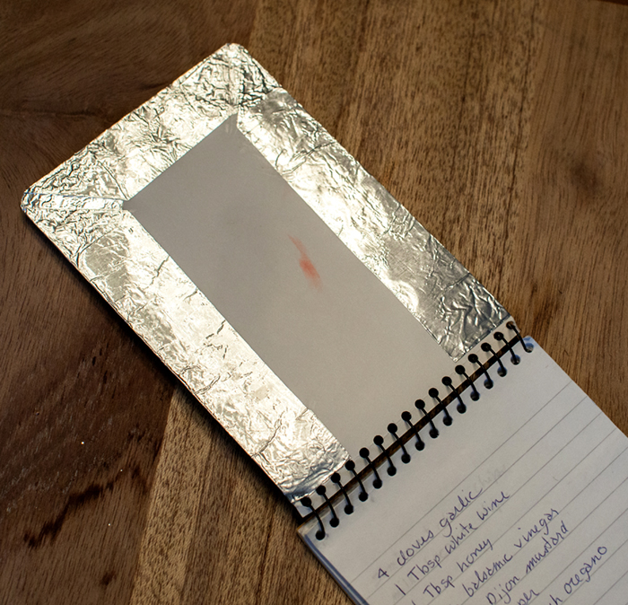 Tin foil is glued on the cover of a memo pad.
