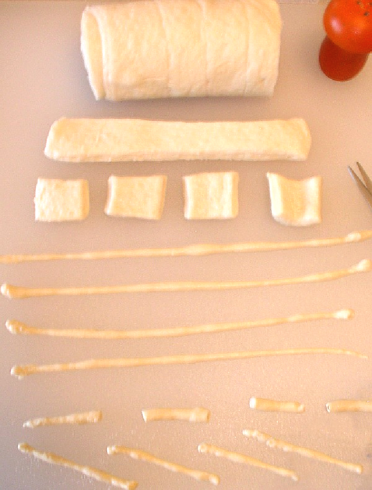 Cut the dough into pieces and roll into tiny toothpick-size pieces.