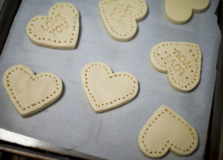 One side of the cutter featured Valentine’s Day sentiments, which were pressed into the shortbread. We also used a fork to press holes around the edges of the cookies.