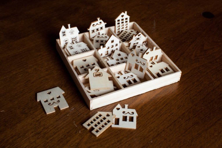 Tiny laser-cut wood houses. These are about 1 1/8″ in height.