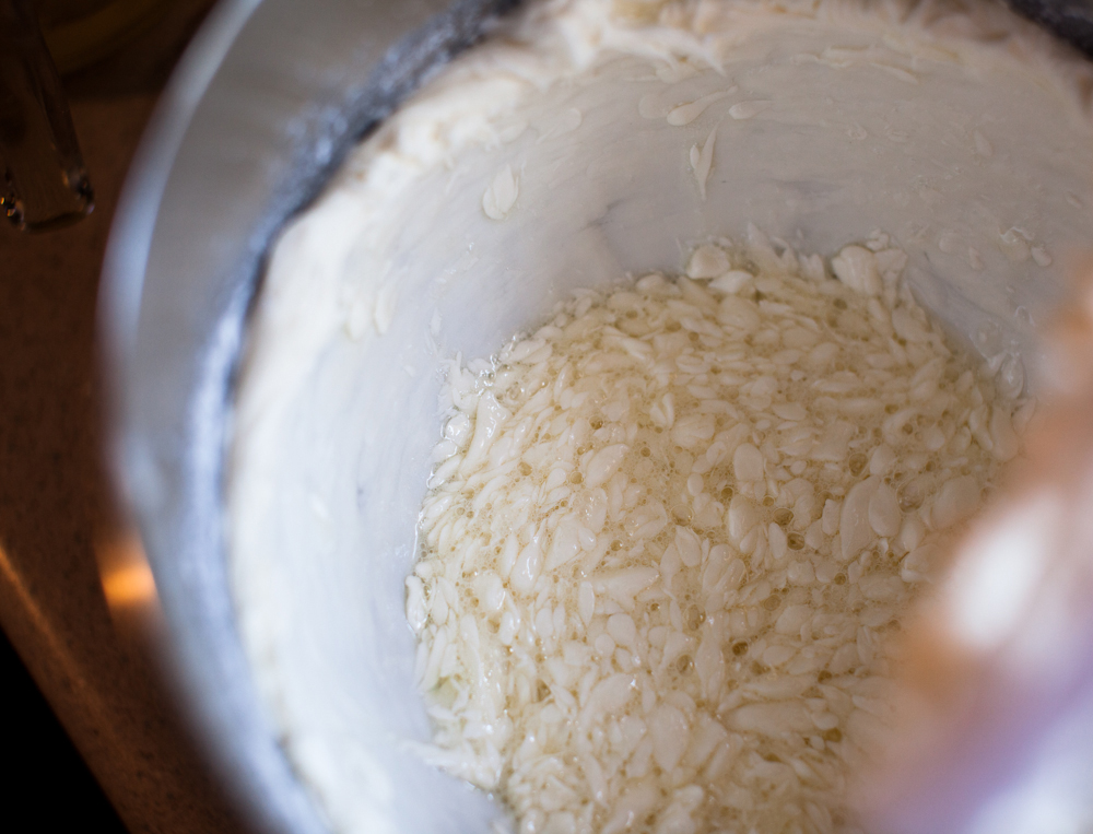 Unsalted butter and egg whites are beaten together for the first part of mixing the batter. I took this photo just because I loved how the slippery butter bits swooshed around the bowl of egg whites.