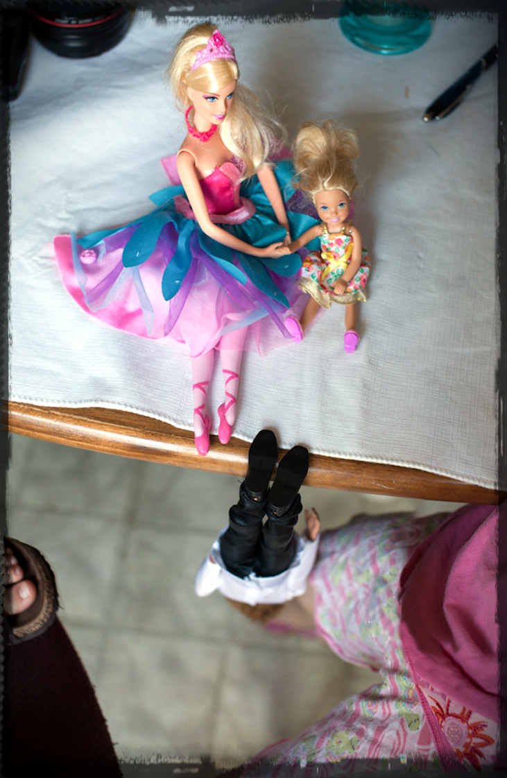 Barbie, Chelsea and Ken play Triopoly but Ken gets grumpy because he lost so he hangs from the table by his feet because he is grumpy.