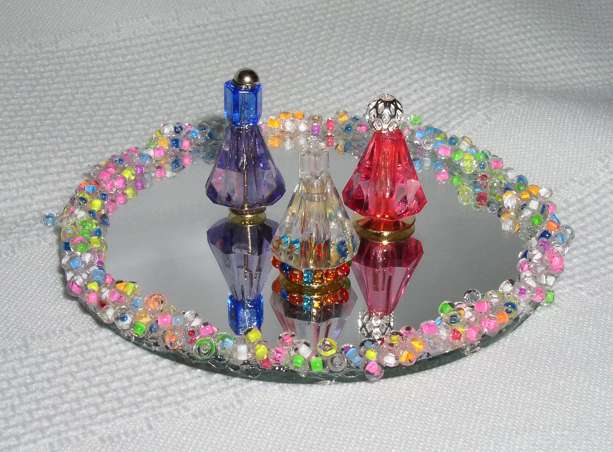 To make the tray, I glued seed beads around the edge of a small mirror.