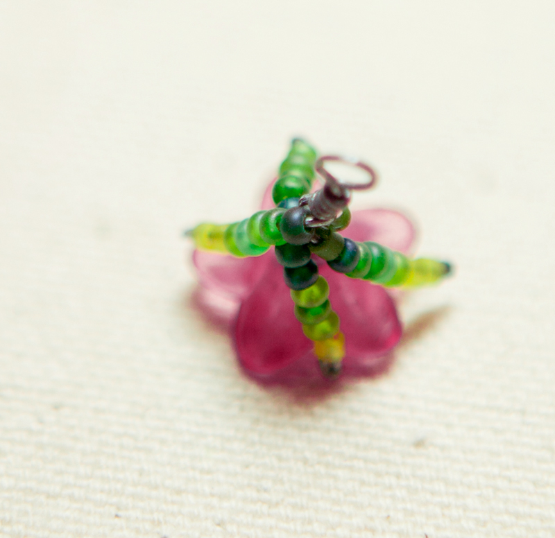The calyx is made of two tiny wires of green beads, twisted around a central wire.
