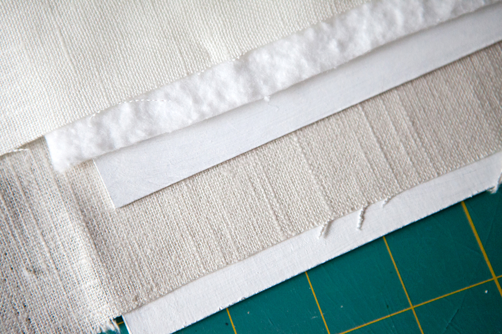 The materials used to make the book cover: Ivory linen over batting over chip board, which is then glued to a larger piece of chip board covered with natural linen.
