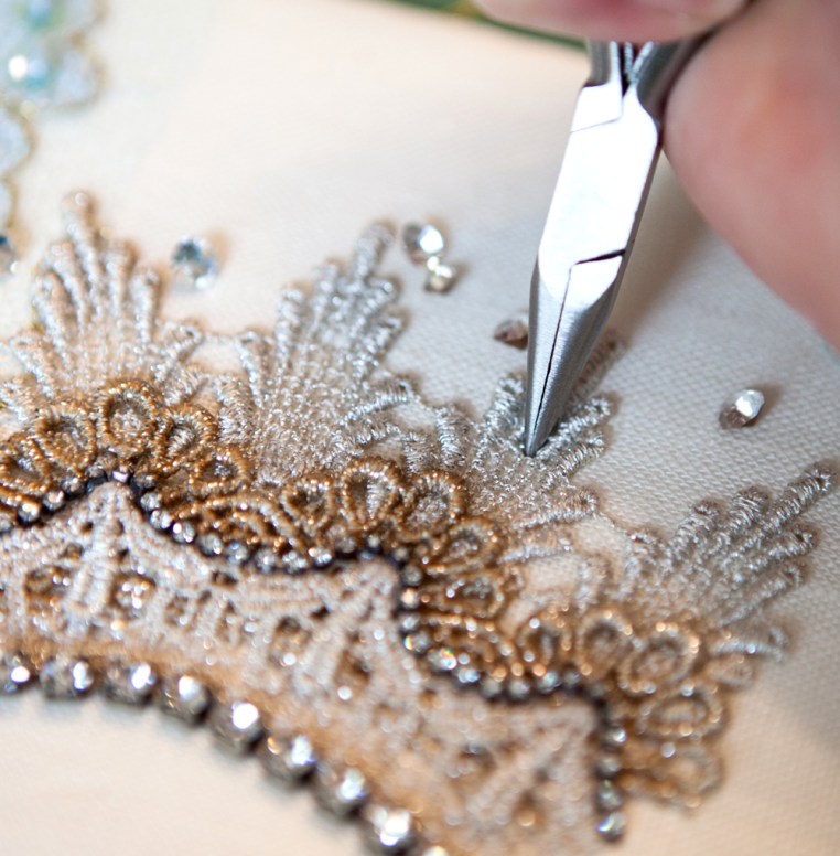 If the gems are large, make a small indentation so they can be set more securely into the book cover.