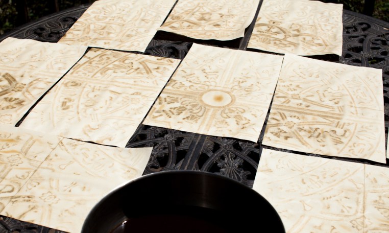 The table is covered with wet paper. The edges of some sheets are already drying and curling up.