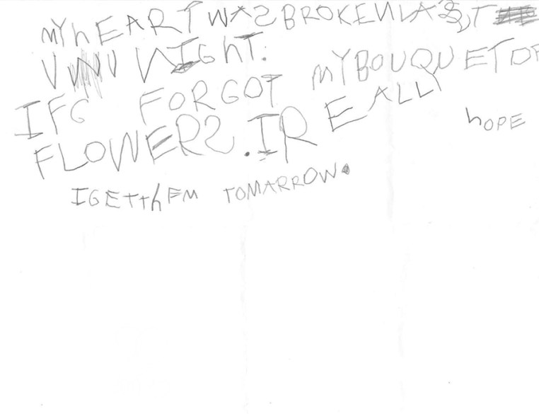 The note my granddaughter wrote to me when she forgot her bouquet.