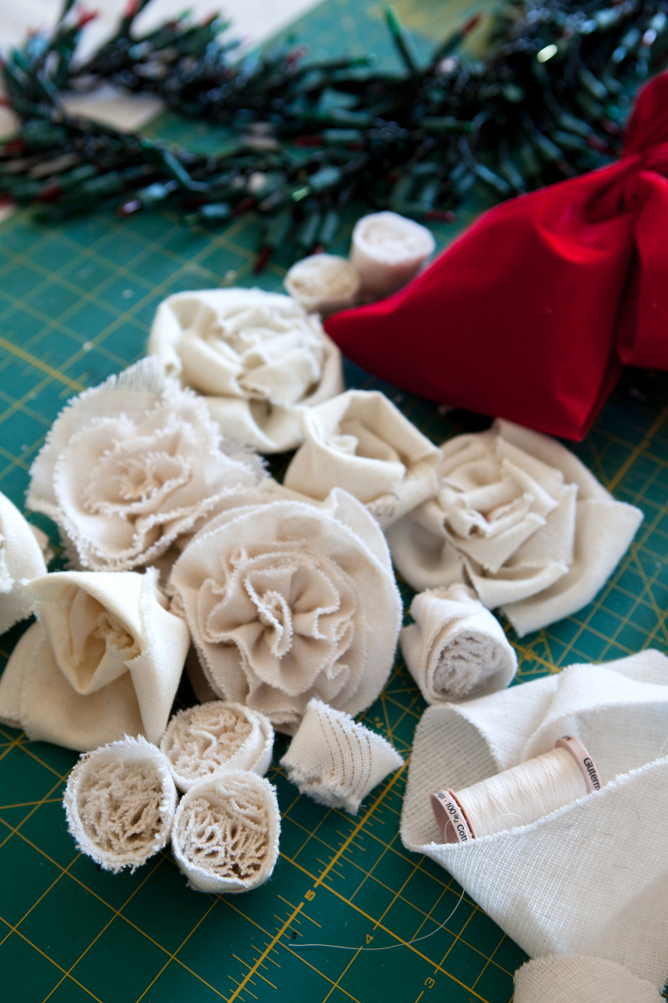 On my worktable – roses, rosettes and ruffle buds made from men’s tie wool interlinings.