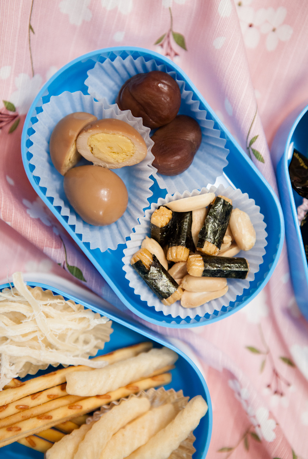 Quail eggs on the upper left, preserved chestnuts at upper right, crispy nori-wrapped snacks with peanuts.