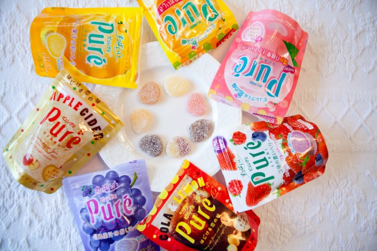 Clockwise from the pink package: Peach, Mixed Berry, Cola, Grape, m, Lemon, Citrus.
