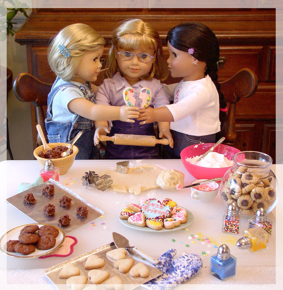 American Girl dolls, Kit, Nellie and Josefina, bake Valentine cookies together.