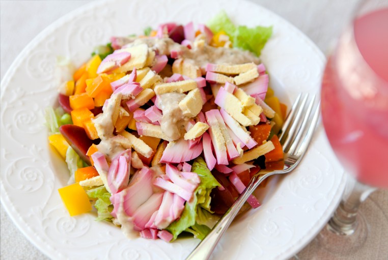 Salad Ingredients: romaine lettuce, spinach, yellow and orange bell peppers, edamame, sliced pickled eggs and pickled beets. The dressing is a tahini based Goddess Dressing from Trader Joe’s. In the glass: Pink Lemonade.