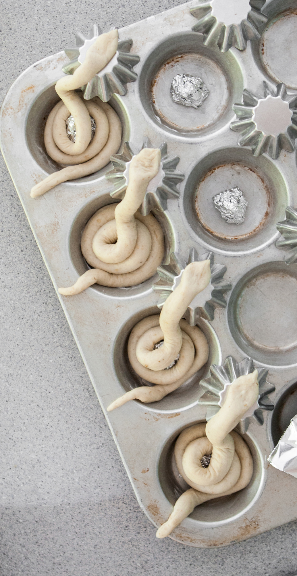 The sourdough “snakes” are formed into snakes and positioned over a foil ball and tart tin.