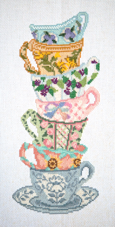 Teacups cross stitch, with pretty purple berries and a softer bow on the pink teacup.