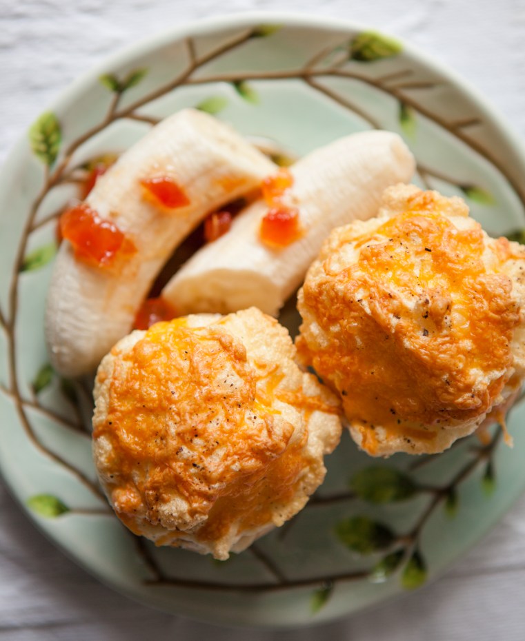 Meringue Breakfast Buns, served with banana drizzled with Tomato Marmalade.