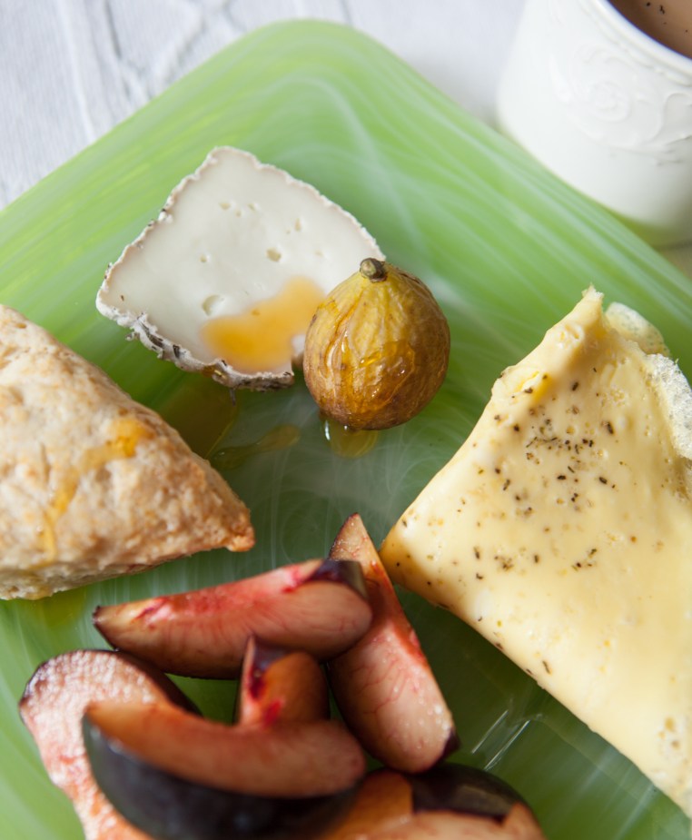Ripe fig with goat cheese, plum, omelet, biscuit and honey