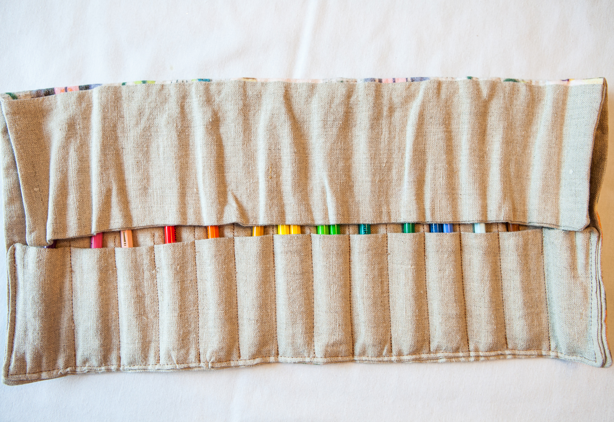 The pencil roll open, with flap folded over to protect pencil tips and keep the pencils from spilling out during transport.