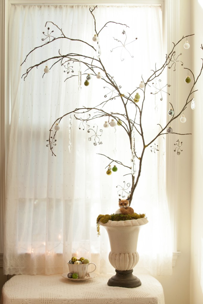 Snow and Crystal Tree, with vintage chandelier crystals and snowflakes made from dried vine tendrils.