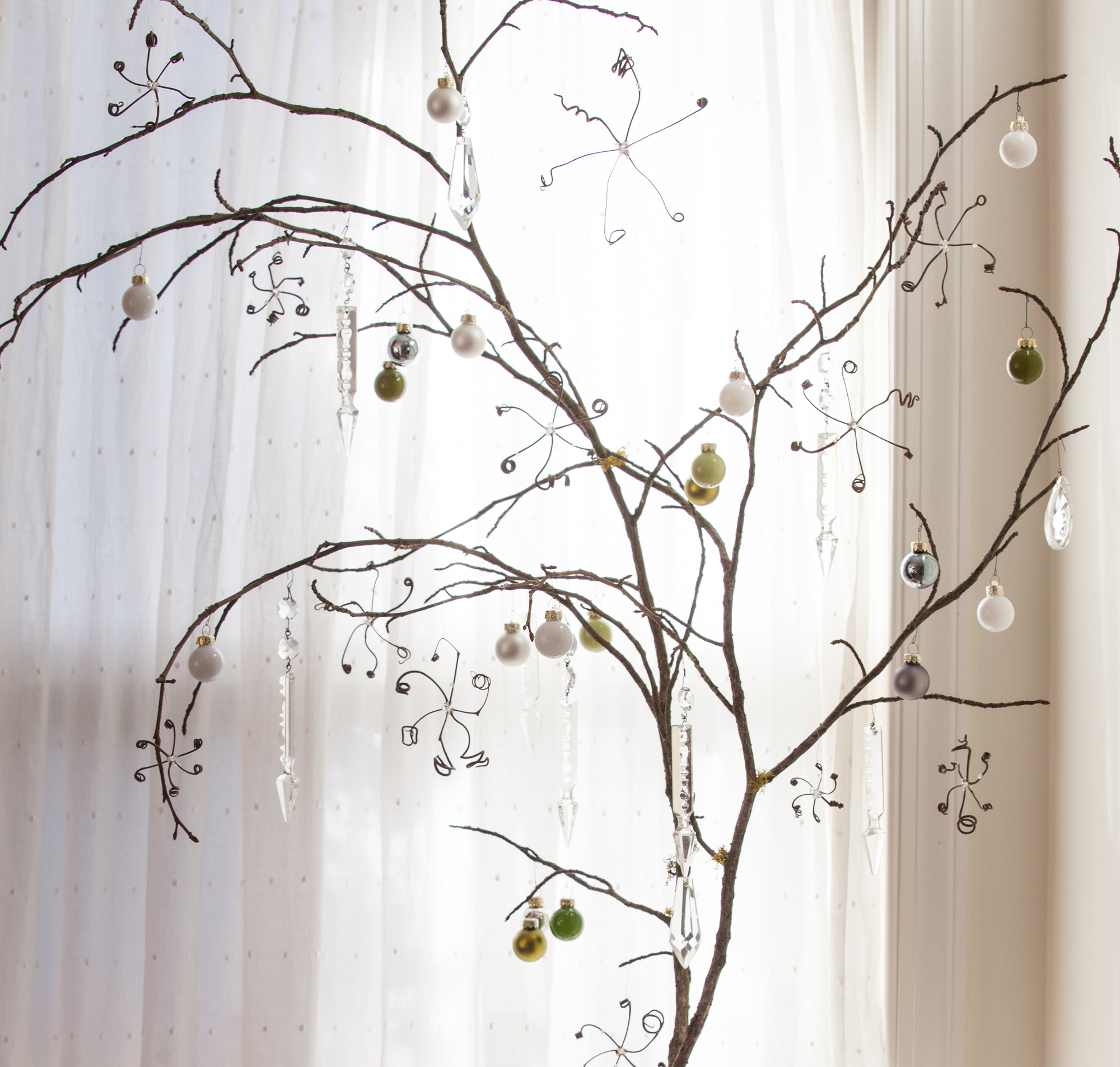 Dried vine snowflakes, little 1″ glass ball ornaments and vintage chandelier crystals.