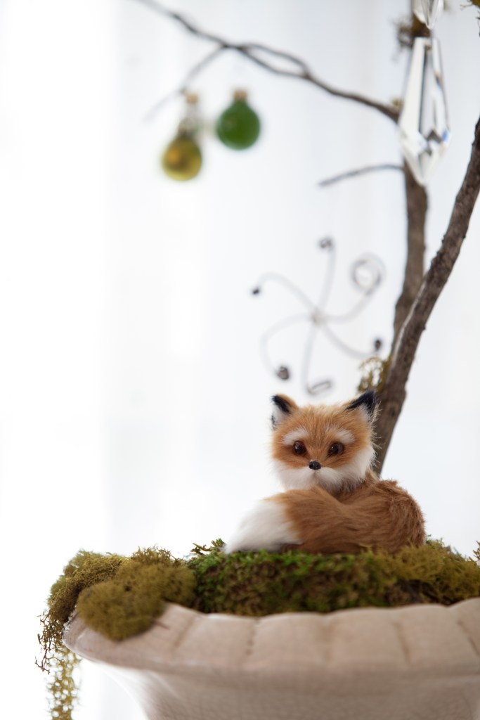 A furry, little red fox ornament sits at the base of the Snow and Crystal Tree.