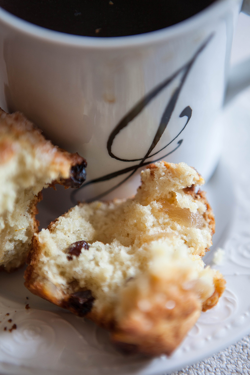 Spicy bits of crystalized ginger and raisins stud this ginger & cardamom muffin.