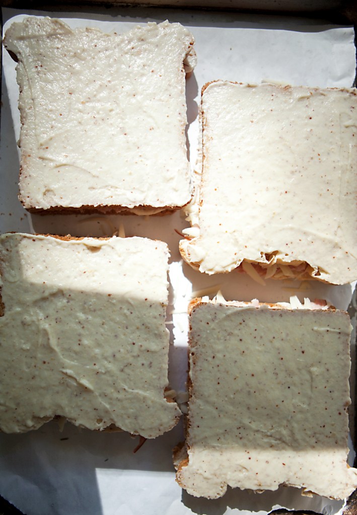 The remaining four slices of bread had more mustard bechemel spread on and placed on the sandwiches.