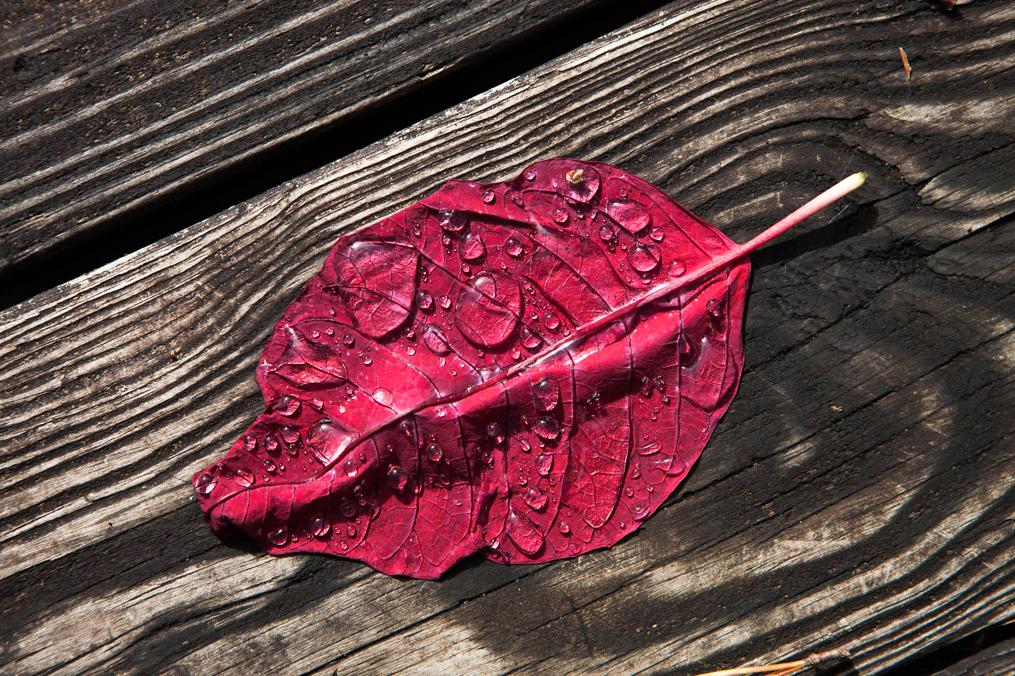 The poinsettia leaf had fallen but it was still good for something. It held rain.