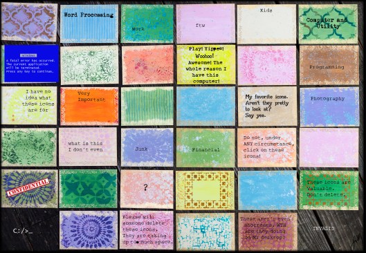 My computer desktop is usually littered with an unmanageable mess of icons. I painted a bunch of 4″ x 6″ cards for an e-course I’m taking and decided to photograph the cards to make a Desktop Background icon sorter before finishing the cards. Click on the photo to see larger image. Feel free to save it and use as wallpaper.
