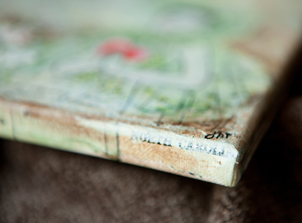 I dipped each sheet of drawing tablet paper into the coffee dye and let it drain a little against the edge of the pan. Within seconds of being laid on the table, the table design showed up on the paper! Here you can see the still-wet sheen of coffee on the paper.