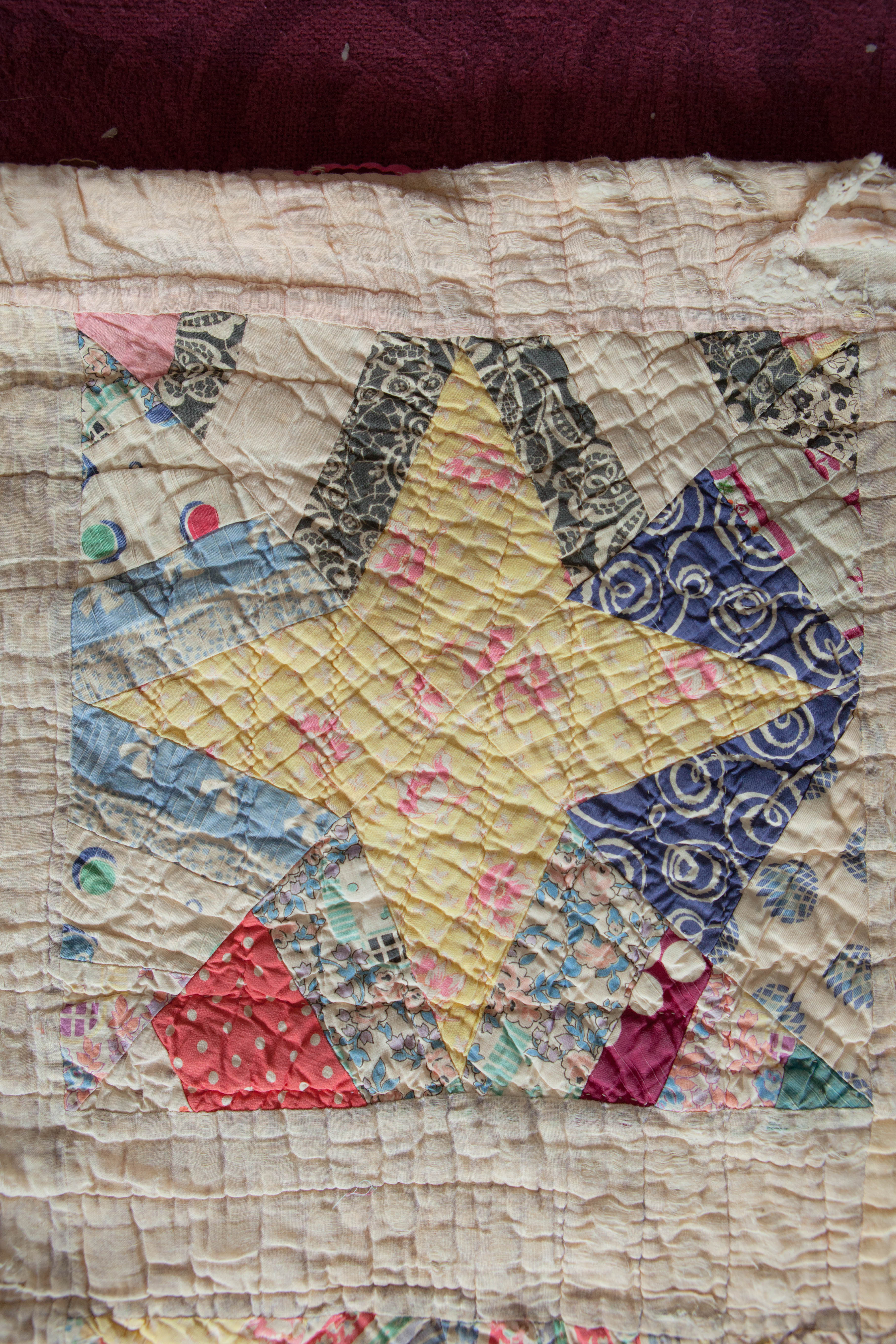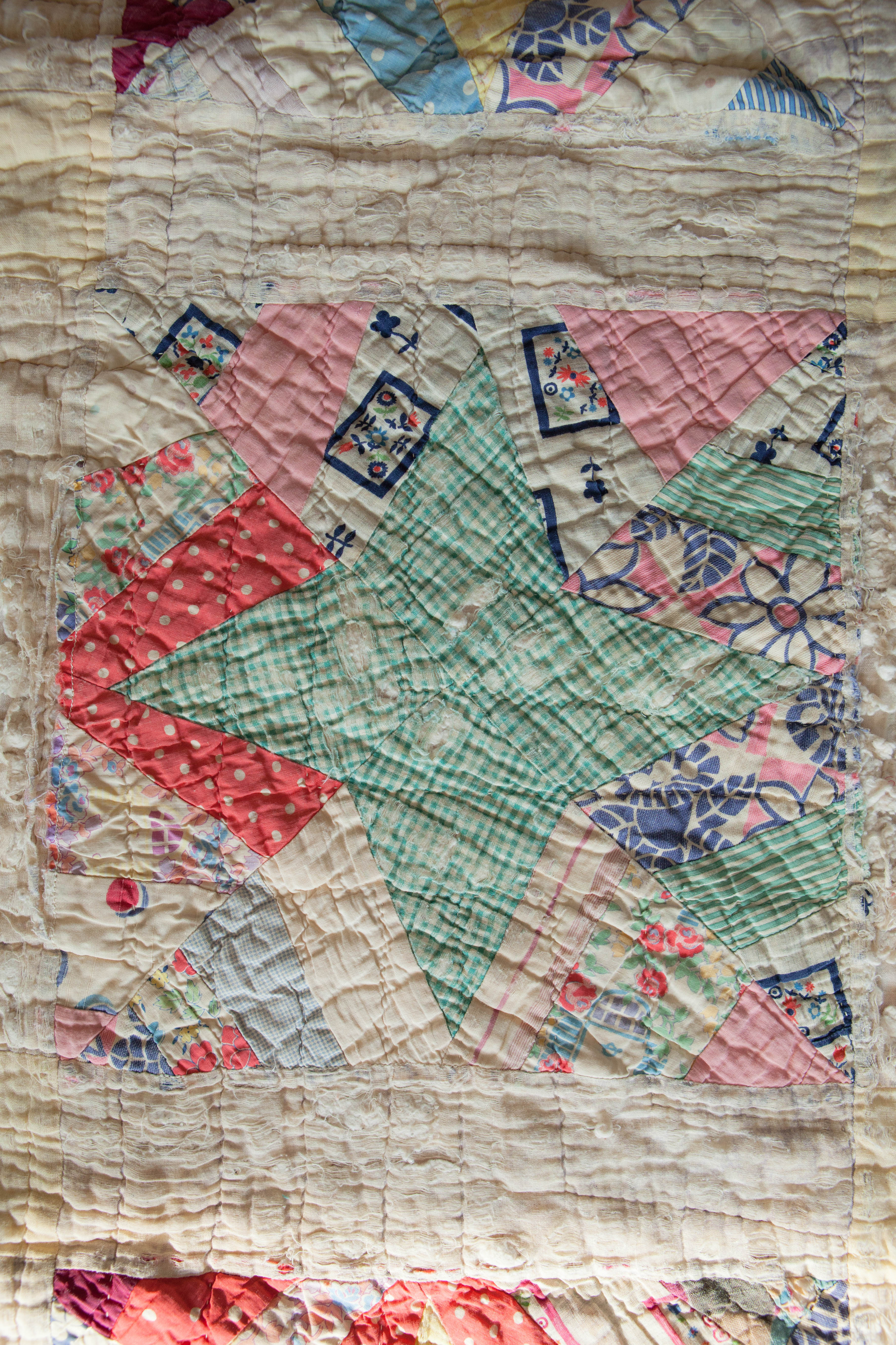 We spread out the fabrics that her Great Grandma got her for her 7th birthday. What a surprise to see that so many of the fabrics matched the sketch! It was important that the colors and sheerness match so we dug through my bins of fabric too to find all the pieces.