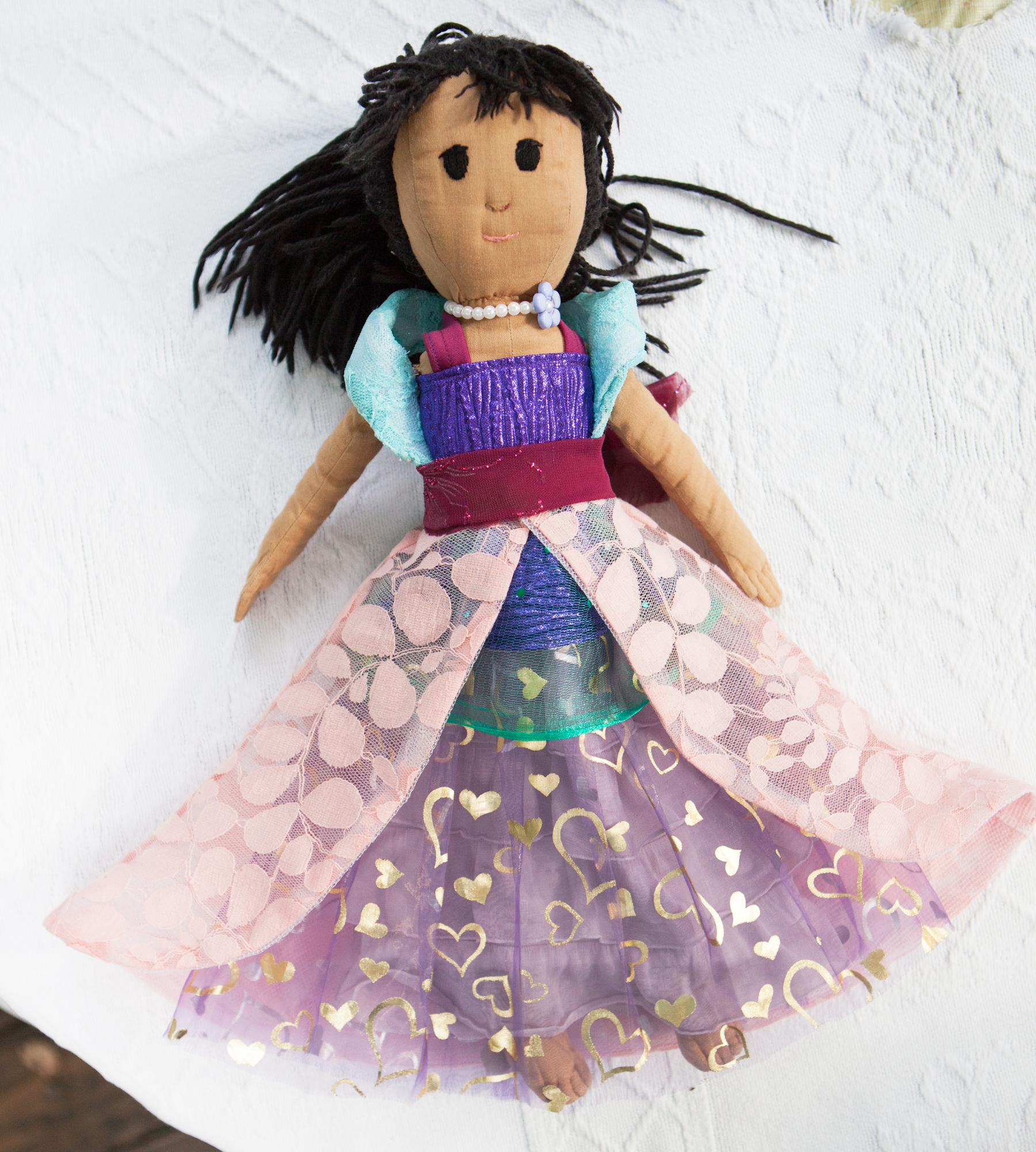 The Princess doll dress is finished! She loves it! The design and colors are all her own, inspired by the sketch in her sketchbook.
