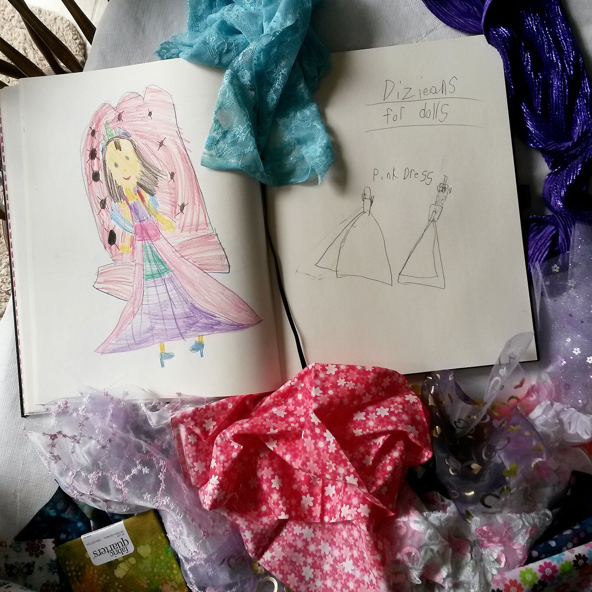 She visited again and we got out the sketchbook. For the first time I really looked at her drawing. What a splendid imagination she has! I was amazed at how much her sketch looked like her doll so I told her we would make the princess dress for her doll.