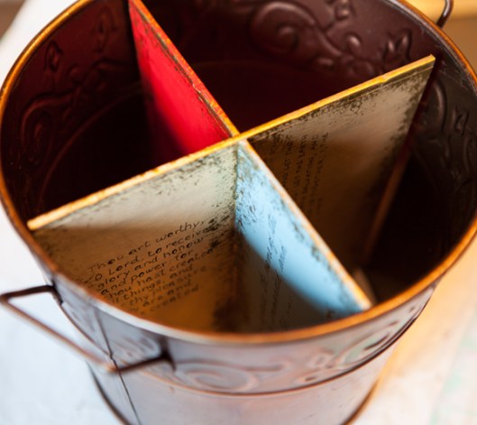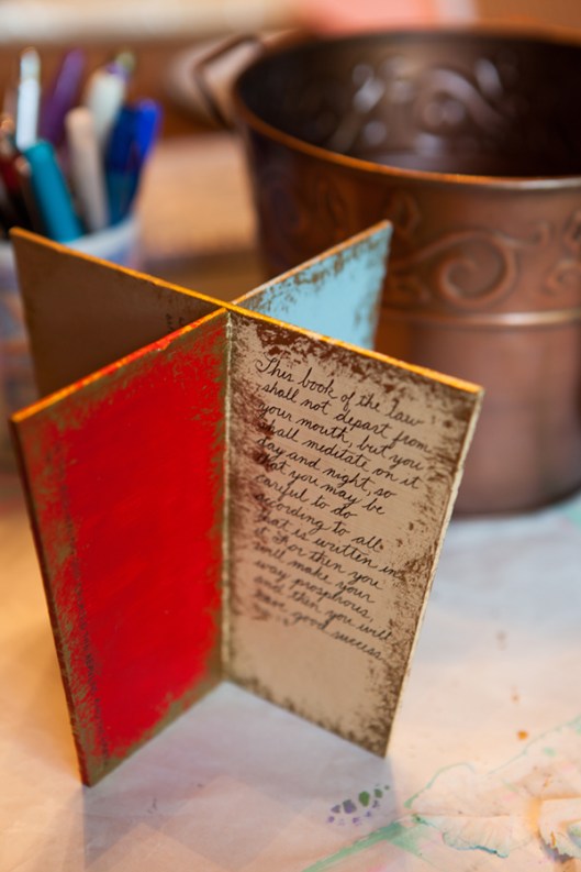 The J Book was the most complicated book to create. The photos taken of flowers growing in our yard are all separate, attached together with string and suspended from the book with string. They fold into the book accordion-style. Because of the weight of the photos, I glued rocks into the base of the J book for stability. Some rocks were kept loose inside the J and are used for display when the book is opened. When the book is stored on my library shelf, I keep it wrapped with a green cord to keep it closed and to keep the loose rocks inside.