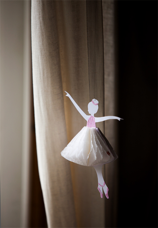 The ballerinas were drawn in Photoshop, based on a similar project in Marie Claire Idees magazine. I had to modify the Marie Claire version since it was flat, not with a full honeycomb skirt. Here you can see the honeycomb bridal shower garland from which I cut the skirts.