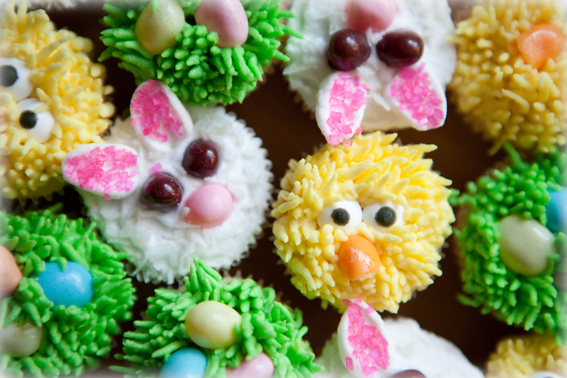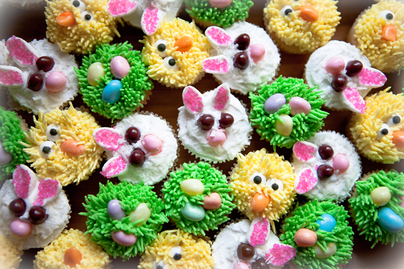Mini Easter cupcakes – Bunnies, chicks and eggs in grass. The bunny eyes and nose are mini jelly beans cut in half. The orange chick beak is a mini jelly bean cut in half diagonally.