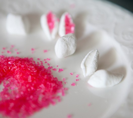 To make the bunny ears, I cut mini marshmallows on the diagonal and then pressed the sticky cut side into pink sugar.