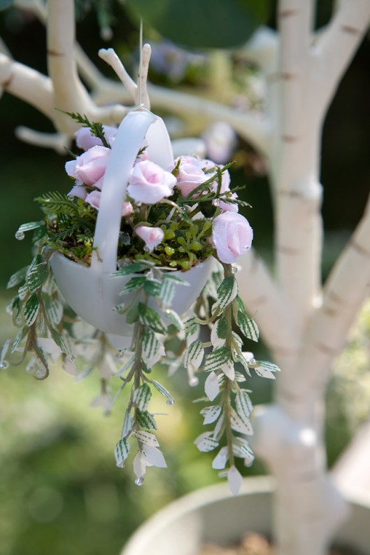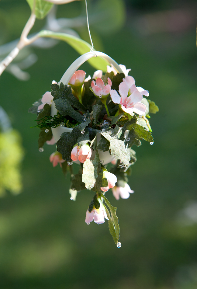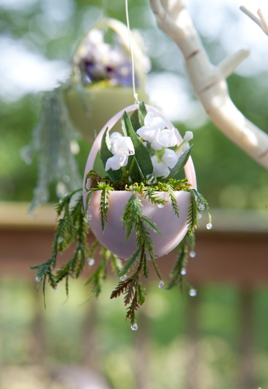 These little hanging plants are made from bits and pieces cut from artificial plants and flowers tucked into plastic eggs. Click on photos to see a larger image.